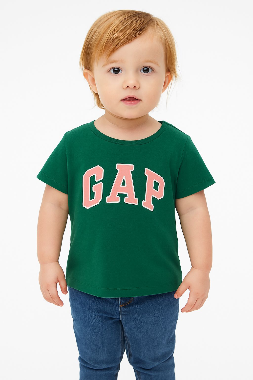 Malha de jersey macia, mangas curtas, gola redonda e logo da Gap na frente.