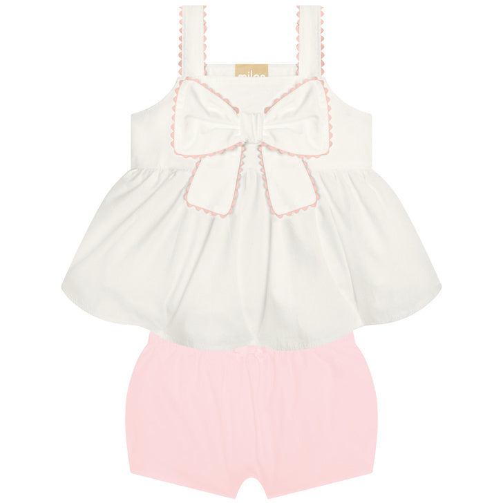 O conjunto bebê menina Milon delicado e cheio de charme para deixar as pequenas ainda mais encantadoras! Confeccionado em tricoline leve e fresquinho, garantindo maciez e conforto ideais para acompanhar os primeiros momentos da infância. A blusa em 100% algodão e forrada em tecido suave 95% poliéster e 5% algodão, apresenta uma modelagem graciosa com babados e acabamento franzido, que trazem leveza e movimento ao visual. O laço com aviamento aplicado na parte frontal é o grande destaque, acrescentando um toque de doçura e sofisticação. As alças delicadas com aviamento embutido deixam a peça ainda mais charmosa.
