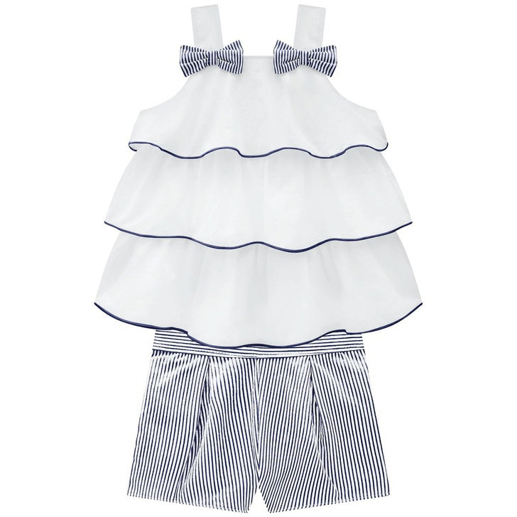 O conjunto infantil menina Milon é um encanto para vestir com leveza e delicadeza. Confeccionado em tecido 100% algodão, unindo conforto, frescor e um design sofisticado para os dias especiais. A blusa em cambraia, é puro charme com sua modelagem em camadas de babados delicados, finalizados com o ponto fru fru, que traz um acabamento cheio de movimento e graciosidade. Os laços aplicados dão um toque lúdico e feminino, tornando a peça ainda mais encantadora.