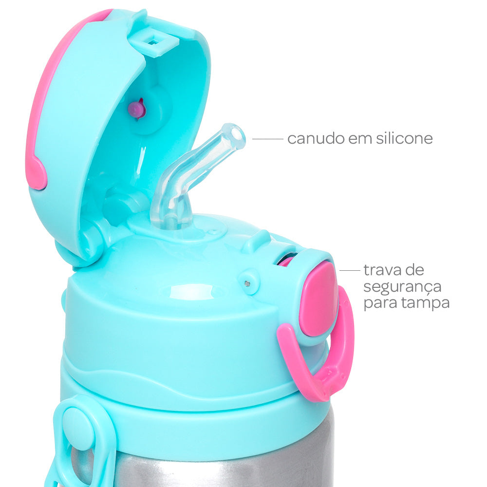 450ml, canudo de silicone, trava de segurança e cordinha antiqueda.