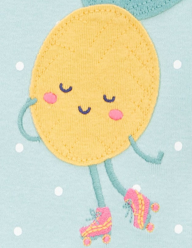 A estampa de abacaxi traz a festa, e as bolinhas a mantêm divertida, com um zíper frontal que facilita a troca de fraldas tarde da noite e pézinhos embutidos que impedem que as meias desapareçam no macacão.