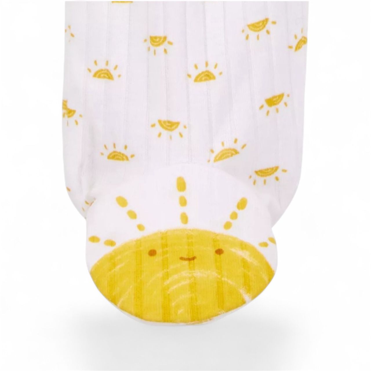 A estampa de sol uma leveza, com um zíper frontal que facilita a troca de fraldas tarde da noite e pézinhos embutidos que impedem que as meias desapareçam no macacão.