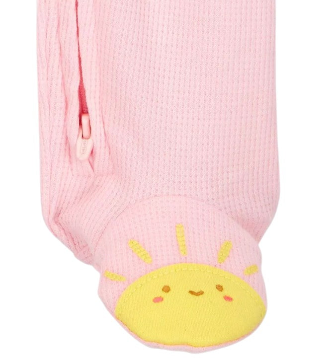 A estampa arco íris traz uma leveza, com um zíper frontal que facilita a troca de fraldas tarde da noite e pézinhos embutidos que impedem que as meias desapareçam no macacão.