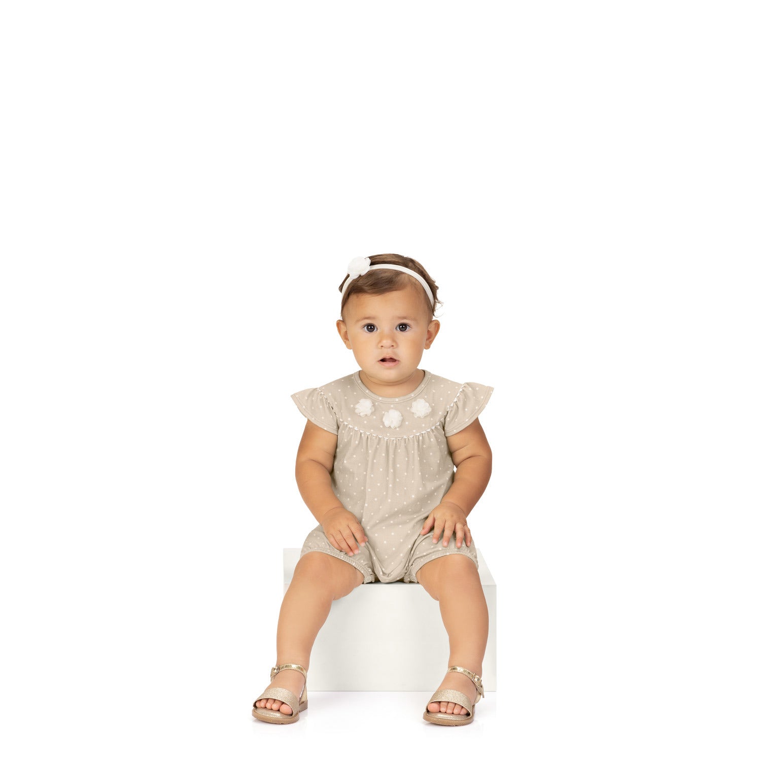 O charme fica por conta da estampa rotativa de poás, clássica e atemporal, combinada às flores aplicadas na pala, que adicionam um toque artesanal e romântico à peça. O babado delicado nas mangas, o decote com gota nas costas e o aviamento de sianinha completam o visual com acabamento primoroso. Um macaquinho perfeito para dias cheios de carinho e alegria, porque cada detalhe foi pensado para realçar a doçura da sua pequena com o toque sofisticado da Milon.